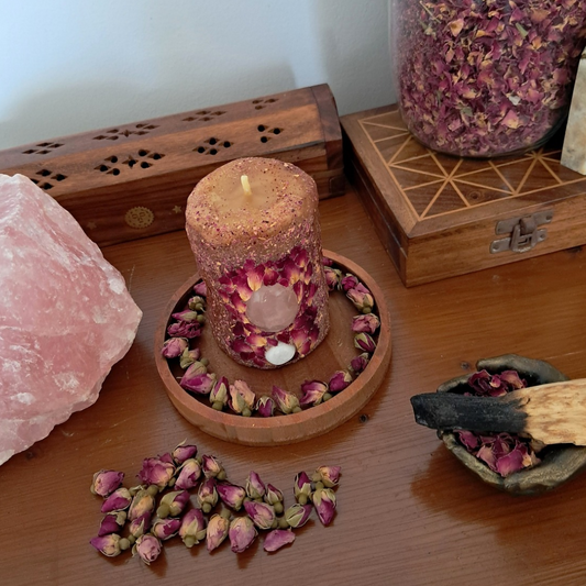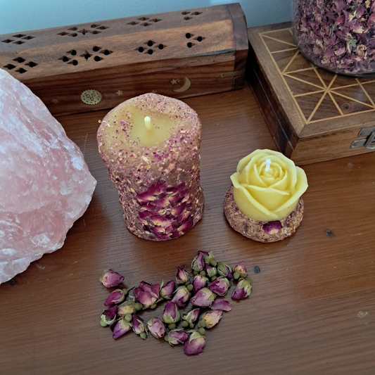 Set of 2 Beeswax Candles (Small Rose Quartz Pillar & Mini Rose) ♡ Sacred Rose