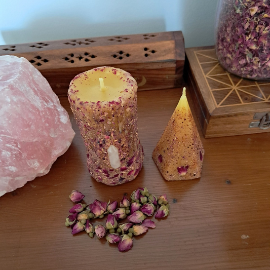 Set of 2 Beeswax Candles (Small Rhodinite Pillar & Mini Dragon's Blood Pyramid) ♡ Sacred Rose