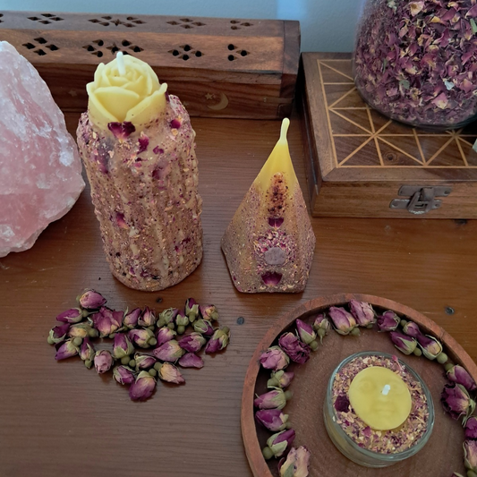 Set of 2 Beeswax Candles (Small Rose Quartz Pillar & Mini Dragon's Blood Pyramid) ♡ Sacred Rose