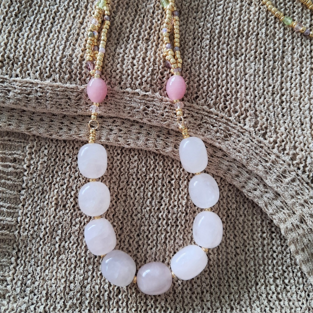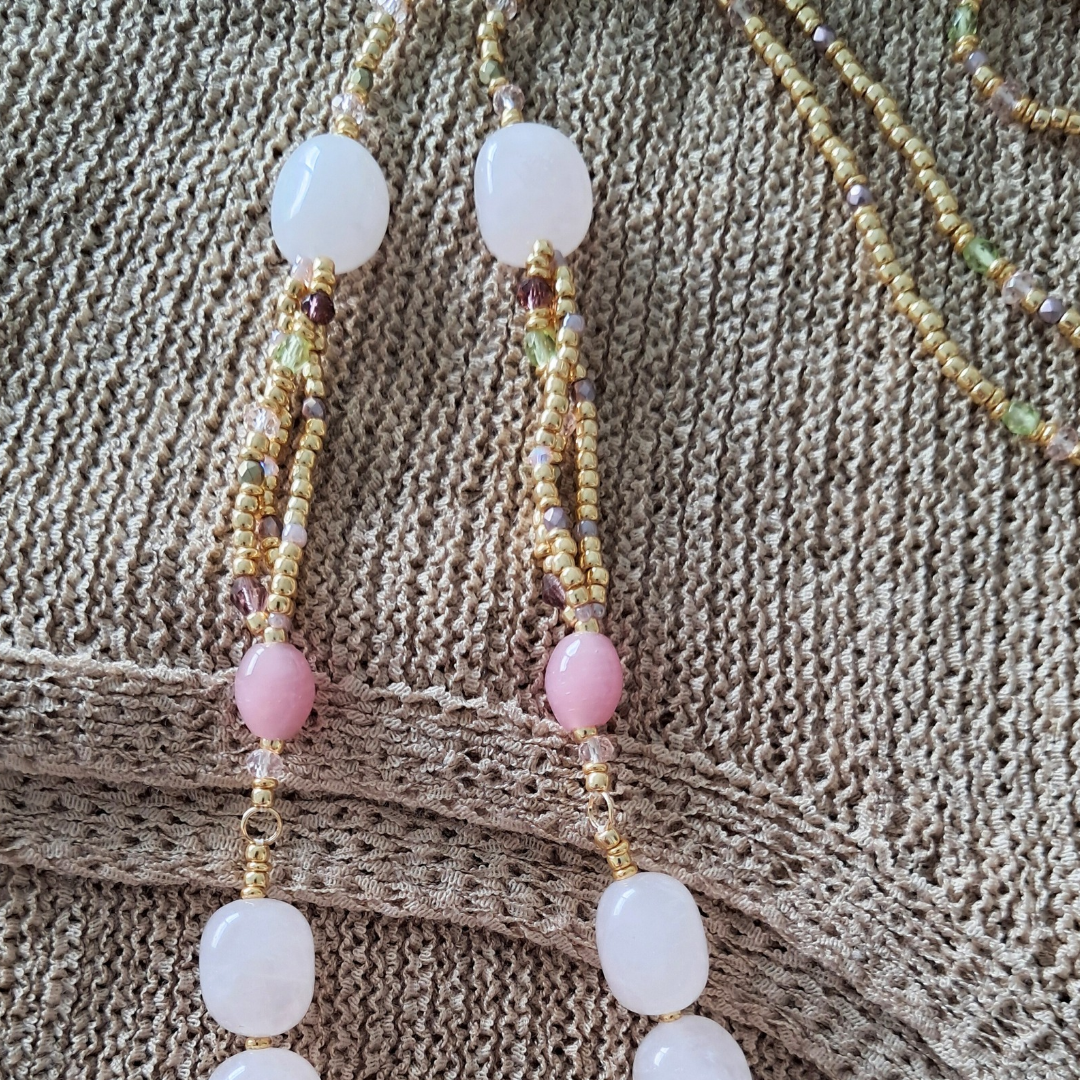 This long beaded necklace pairs gentle rose quartz with pale green and deep mauve tones, creating a dreamy palette that feels both soft and striking.