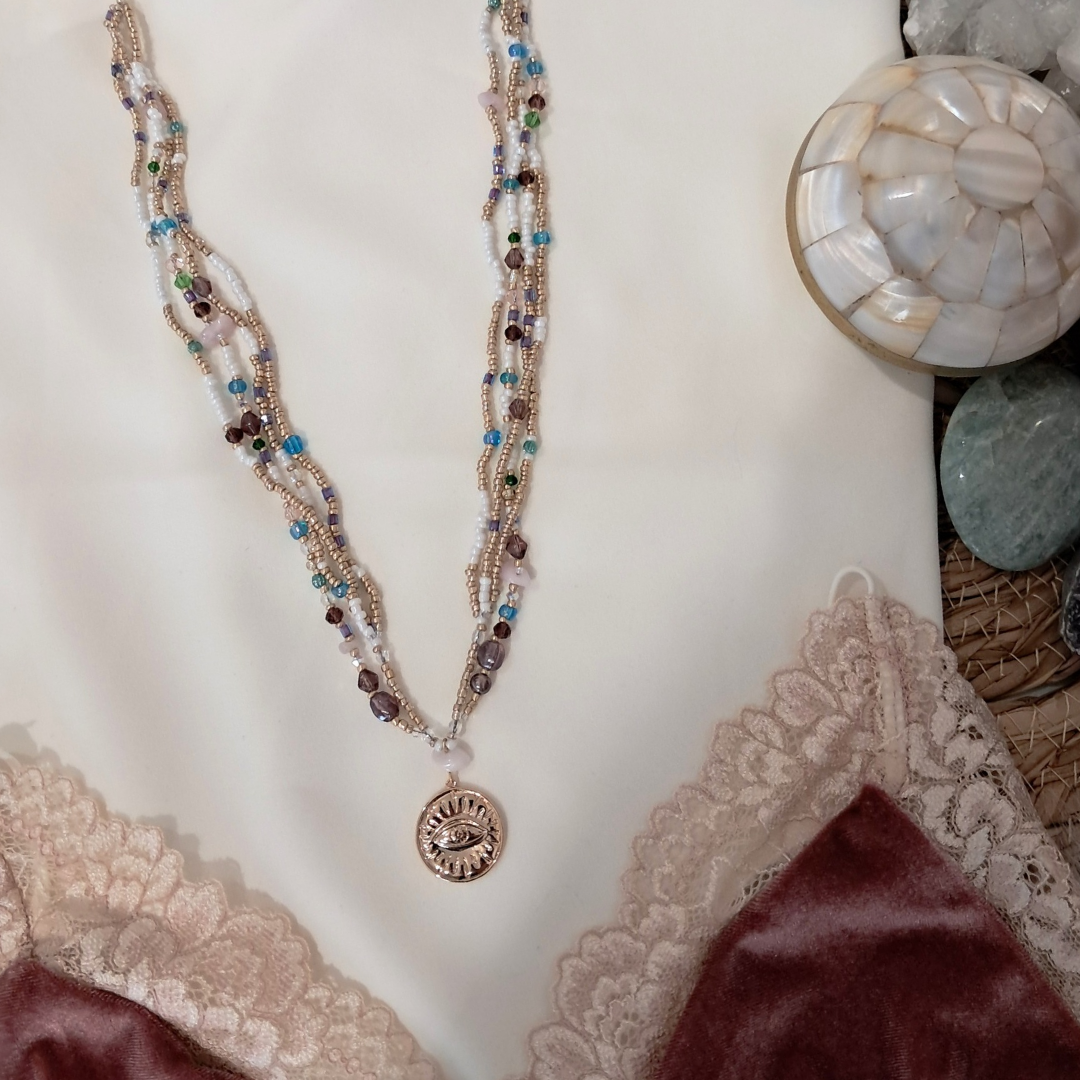 'Eclectic Charm' Beaded Necklace with 14k Gold-plated Evil Eye Pendant