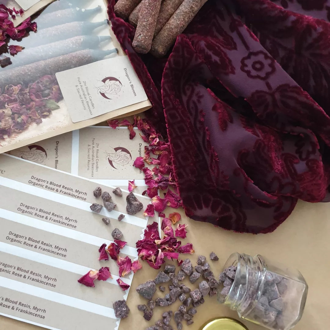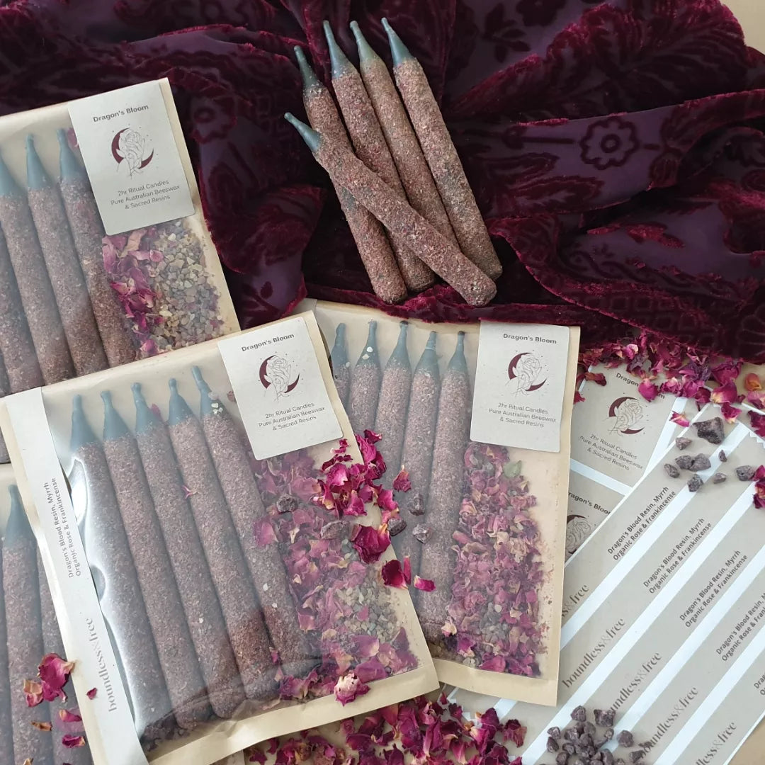 Each taper candle has been generously rolled Dragon's Blood resin, and crushed organic rose, Egyptian frankincense and myrrh.