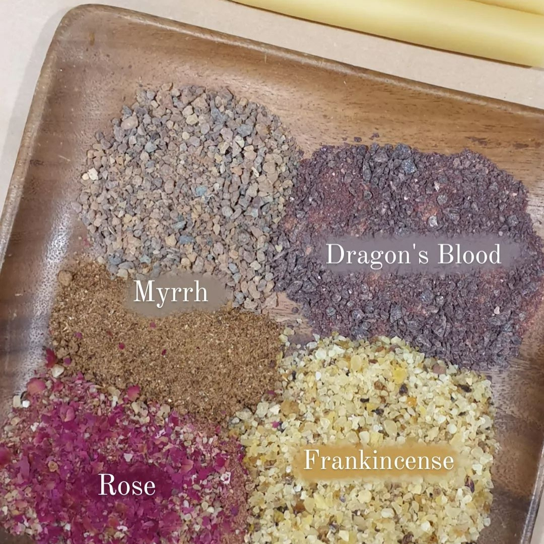 Each taper candle has been dripped with beeswax and generously rolled in Egyptian Frankincense, Myrrh, Dragonsblood Resin, and crushed Organic Rose.